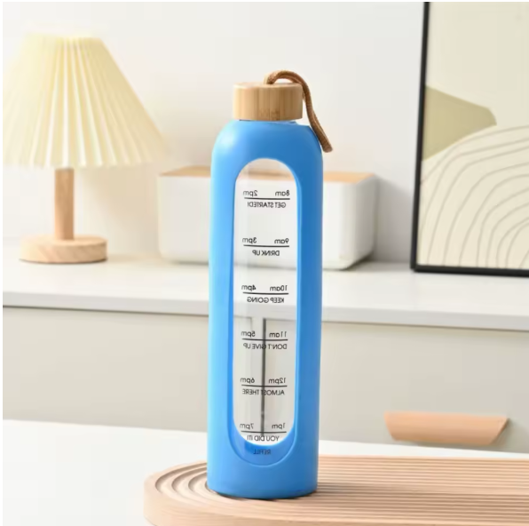 Motivational Glass Water Bottle 1L with Bamboo Lid Silicone Sleeve BPA-Free